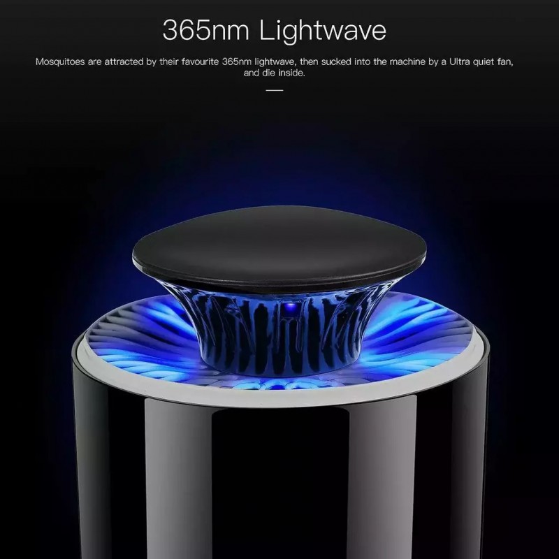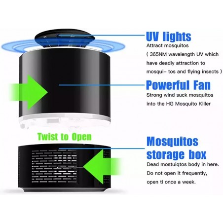 Luz ultravioleta (UV) atrae insectos: La luz UV de alta eficiencia atrae mosquitos y otros insectos voladores, eliminándolos mediante una malla eléctrica interna.