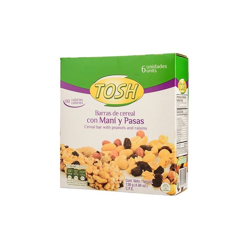 BARRA DE CEREAL TOSH MANI Y PASAS PLEGADIZA x6und NETO x138gr